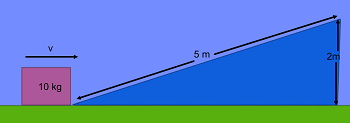 A block travelling at 10 ms-1 travels up the hill shown arriving at the top with a velocity of 4 ms-1