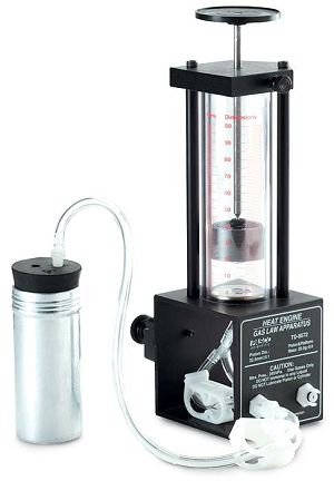The temperature of the air in the metal can is changed by placing it in a water bath. As the water is heated, the gas expands pushing the piston up.