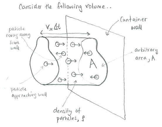 The mass of particles that will strike the wall in a given time is half of those contained within the 'blob' shaped volume shown: