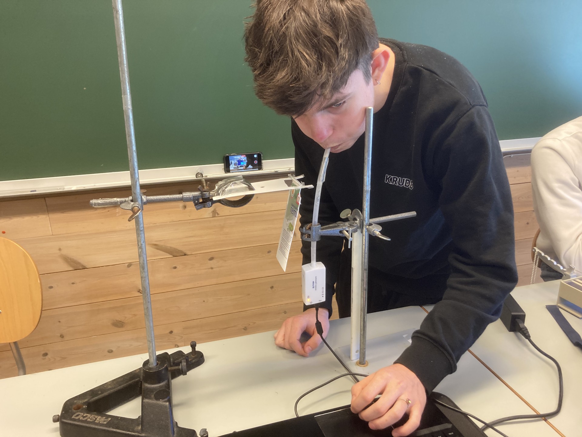 My 1st year students are doing their individual investigations at the moment so I thought I would share one each day. This is Ben, he is blowing down a tube attached to a pressure sensor. There is a little hole in the side of the tube letting out a jet of air. He is measuring the force it exerts on a swinging piece of plastic.