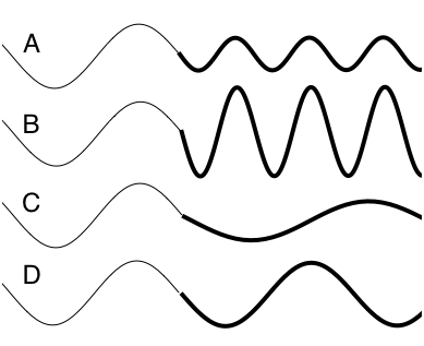 A wave of wavelength 2m travels along a rope. The rope is attached to a second one which has the same diameter but 4 times the density.