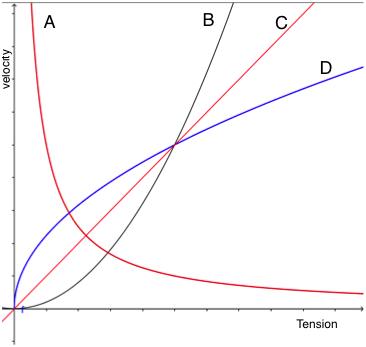 Which line is the correct shape for the velocity of a wave in a string vs the tension of the string?