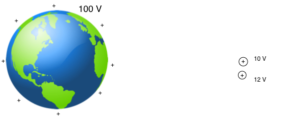 The potential at the surface of a charged sphere, so far from the Earth that the force on it is negligible, is 10 V. The potential at the surface of the Earth is 100 V.