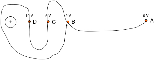 The diagram represents the path of a 2 C test charge moving between A and B via a path that passes through points C and D. The potential at these points is shown.