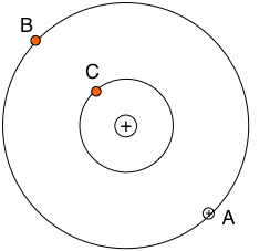 The diagram represents a charge with two lines of equipotential, one at 10 V the other at 20 V.