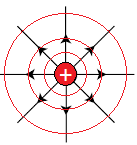 The equipotential surfaces in a radial field are spherical, shown as circles on a 2-dimensional diagram. As potential varies with \(1\over r\) from the centre of the charge, the equipotentials increase in spacing outward from the centre.