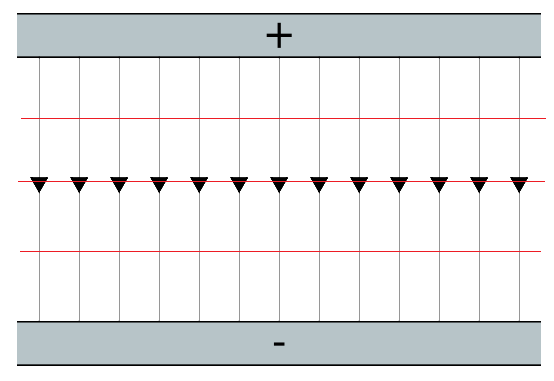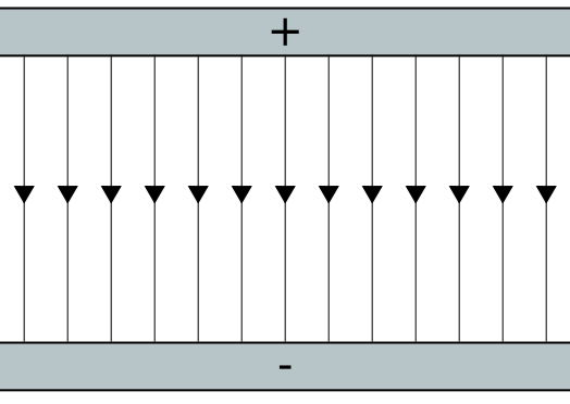 A uniform field has a constant field strength. Field lines are equidistant and parallel, and show the direction of force acting on a positive test charge. Uniform electric fields are formed between oppositely charged parallel plates.