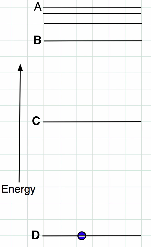 Atomic electrons can only have certain discrete values of positional energy (specific to the type of atom, based on number of protons). This can be represented with an energy level diagram: