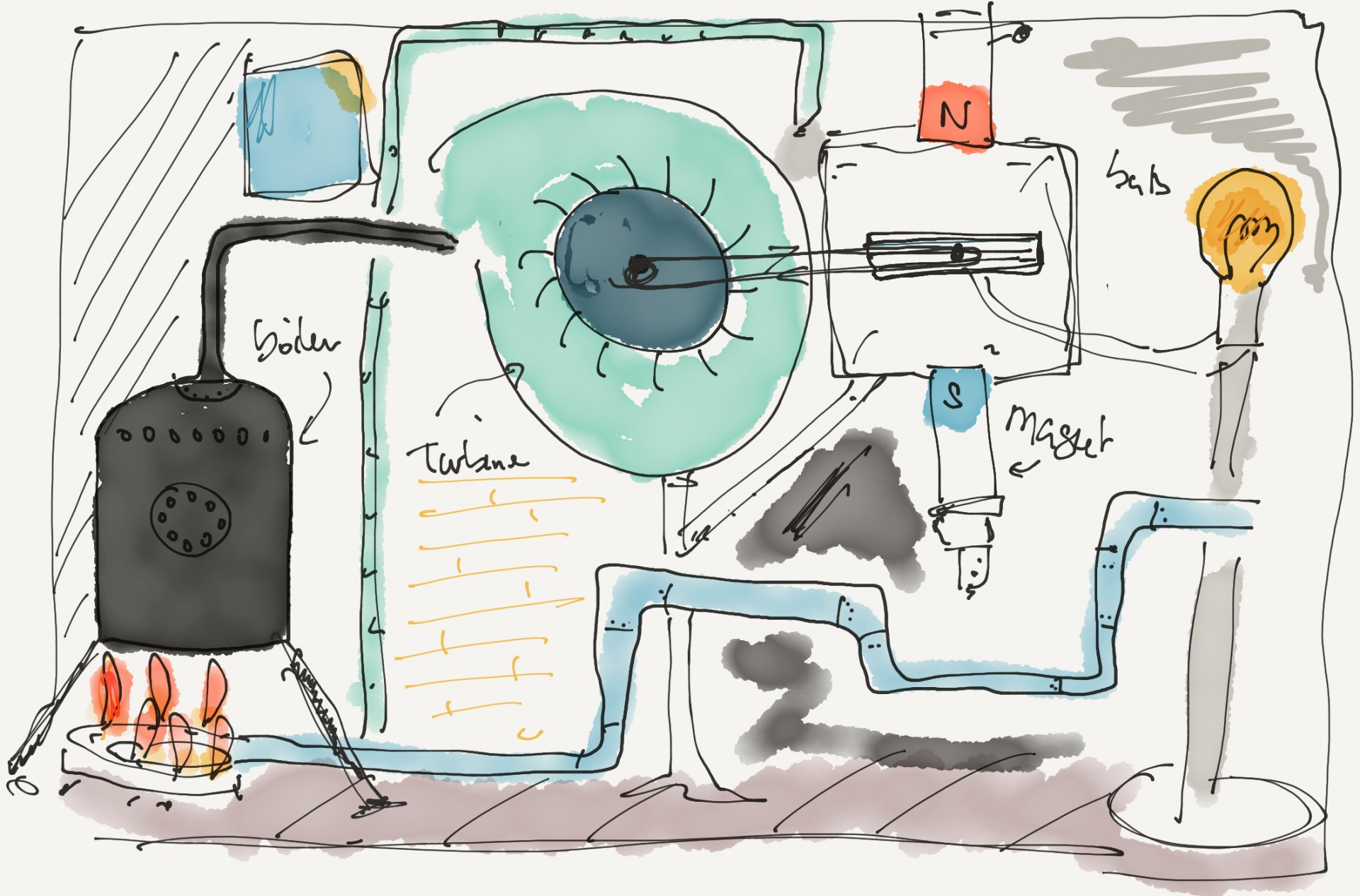 Here we will jump straight in with the most common form of electricity production worldwide - the fossil fuel power station. While quite difficult to draw (see below!), you will learn about the physics principles that govern the four key sections: