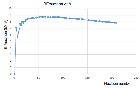 However, if we instead consider the binding energy per nucleon (i.e. total divided by the number), we can observe a much more interesting graph when plotted against number of nucleons. The curve below shows that iron-56 is the most stable nucleus, and that larger nuclei will release energy when split.