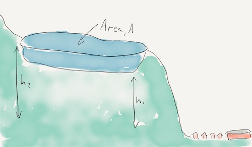 The diagram represents a mountain lake above a town.