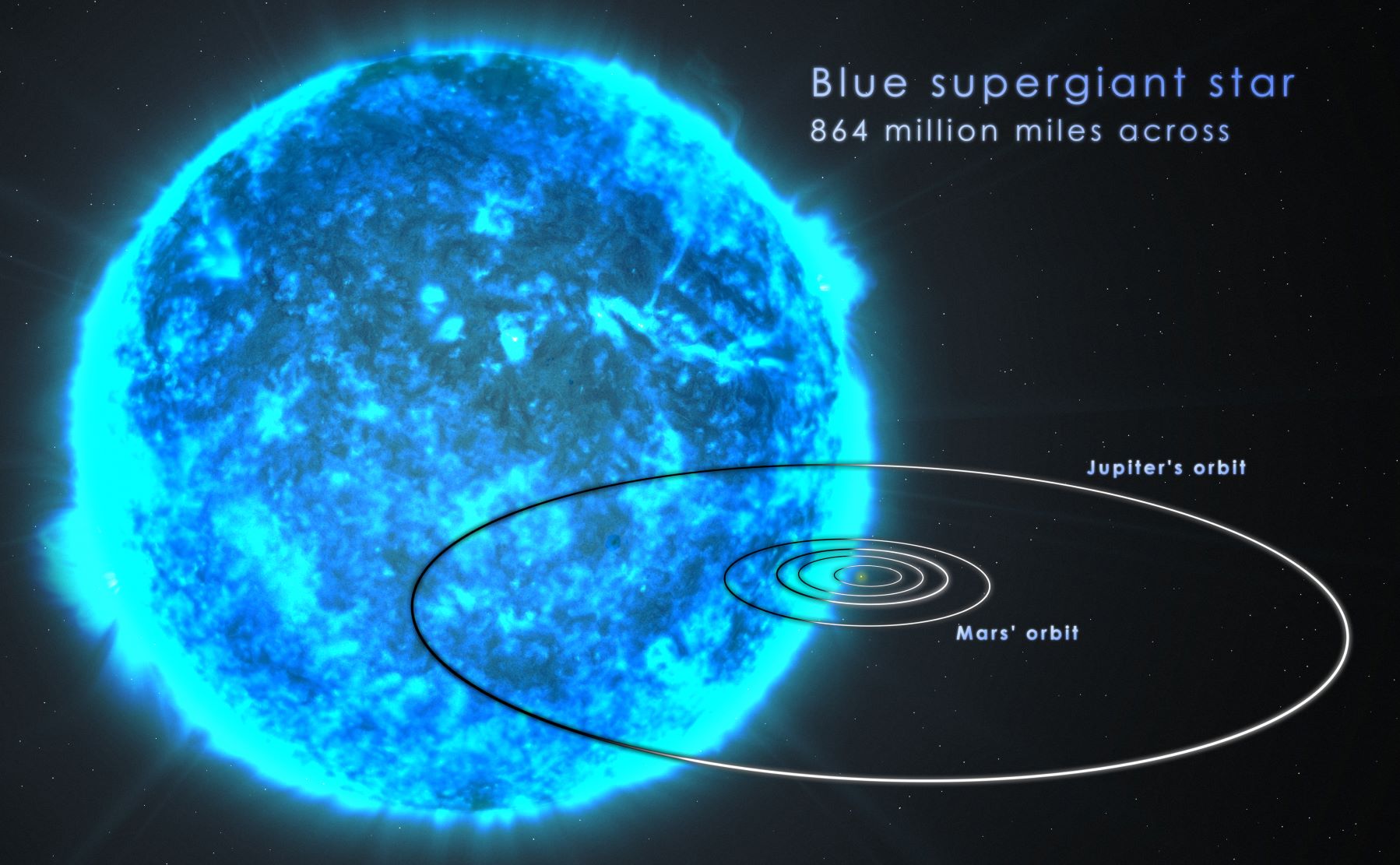 The Sun will never become a super giant, because of its limted mass. However, the image shows the scale of a blue supergiant in comparison to Jupiter's orbit in the Solar System.