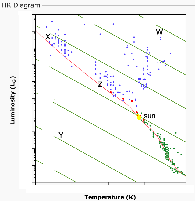 While unlikely to be reproduced on an exam script, this ESO HR diagram also indicates the colour of stars according to their temperature and, hence, spectral class.