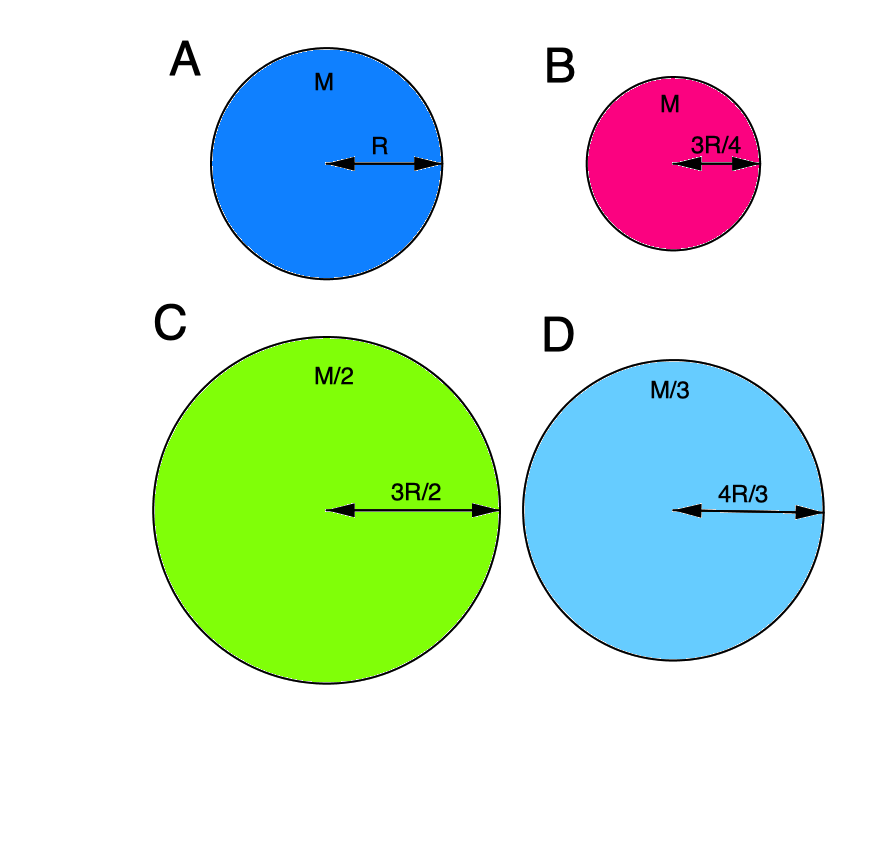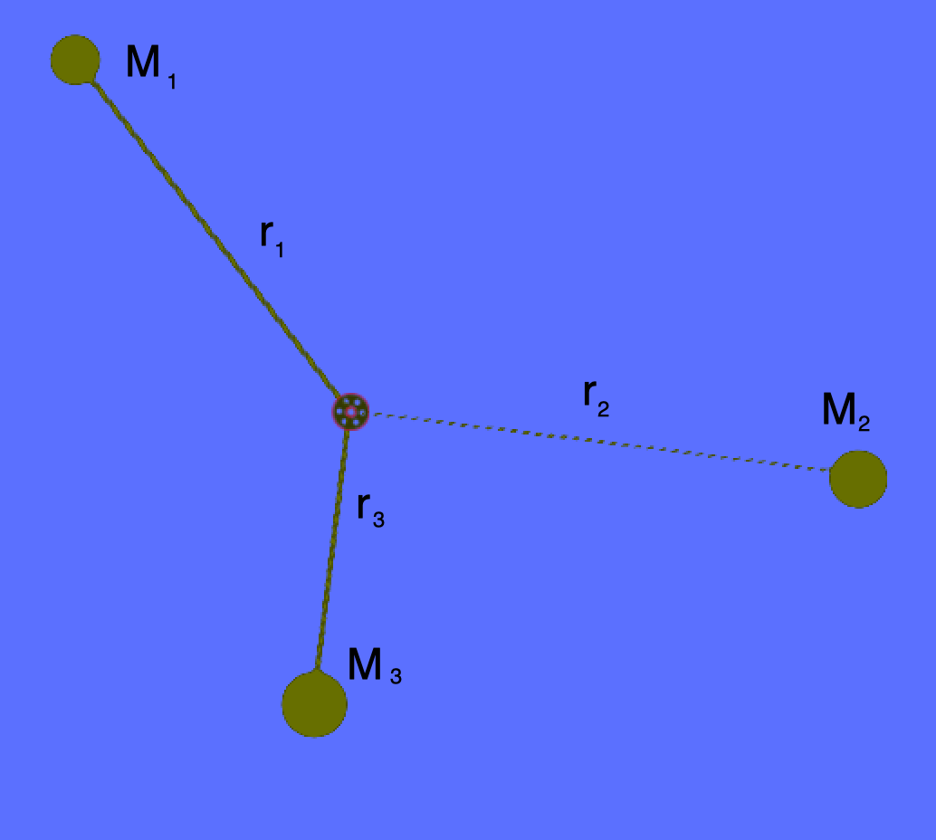 For 3 point masses orbitting a common pivot on massless rods, the moment of inertia is the sum of the moment of inertia of the objects: \(I =M_1{r_1}^2+M_2{r_2}^2+M_3{r_3}^2\)