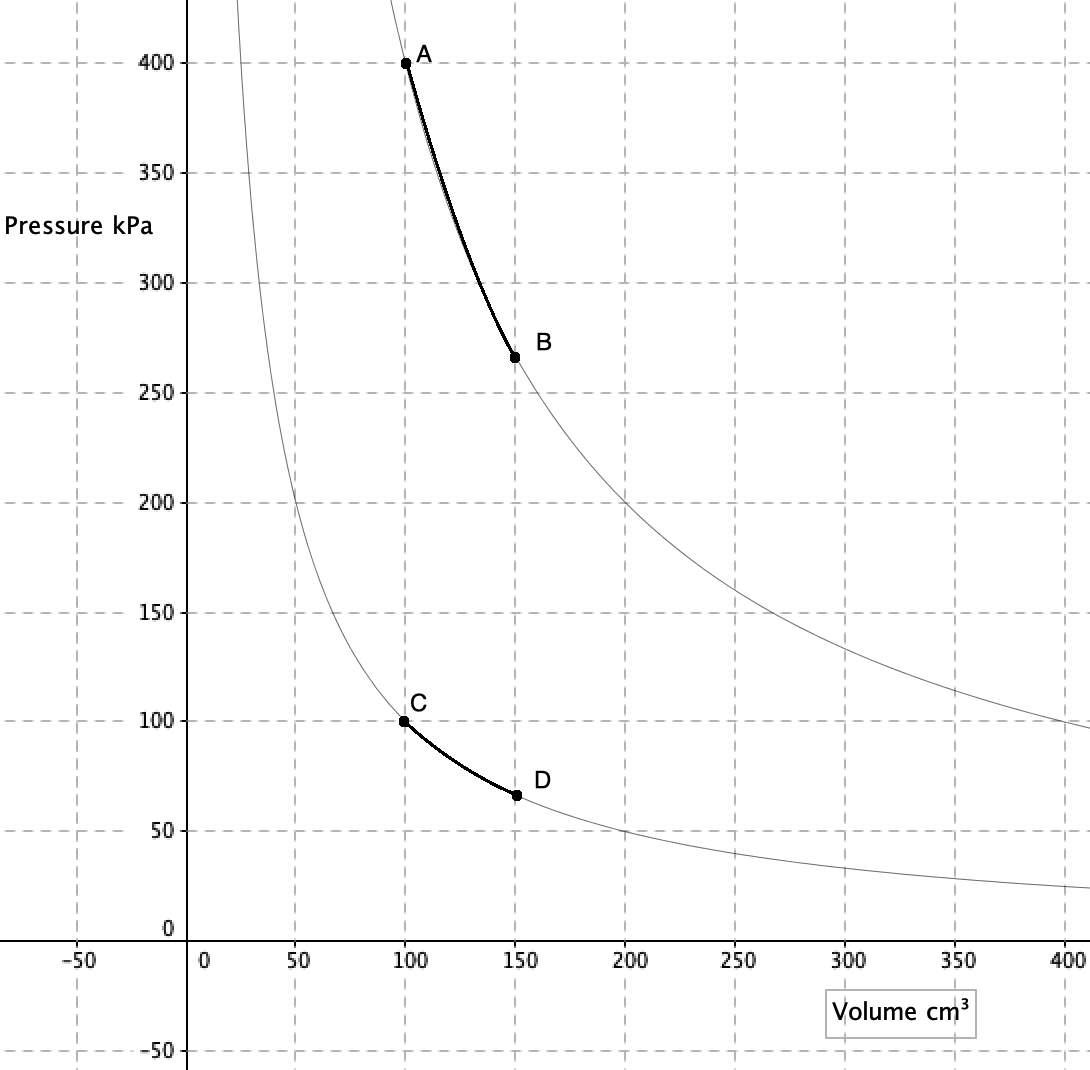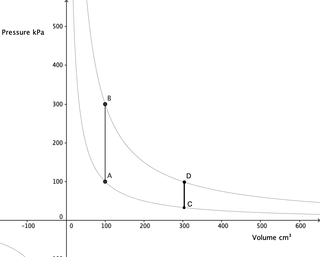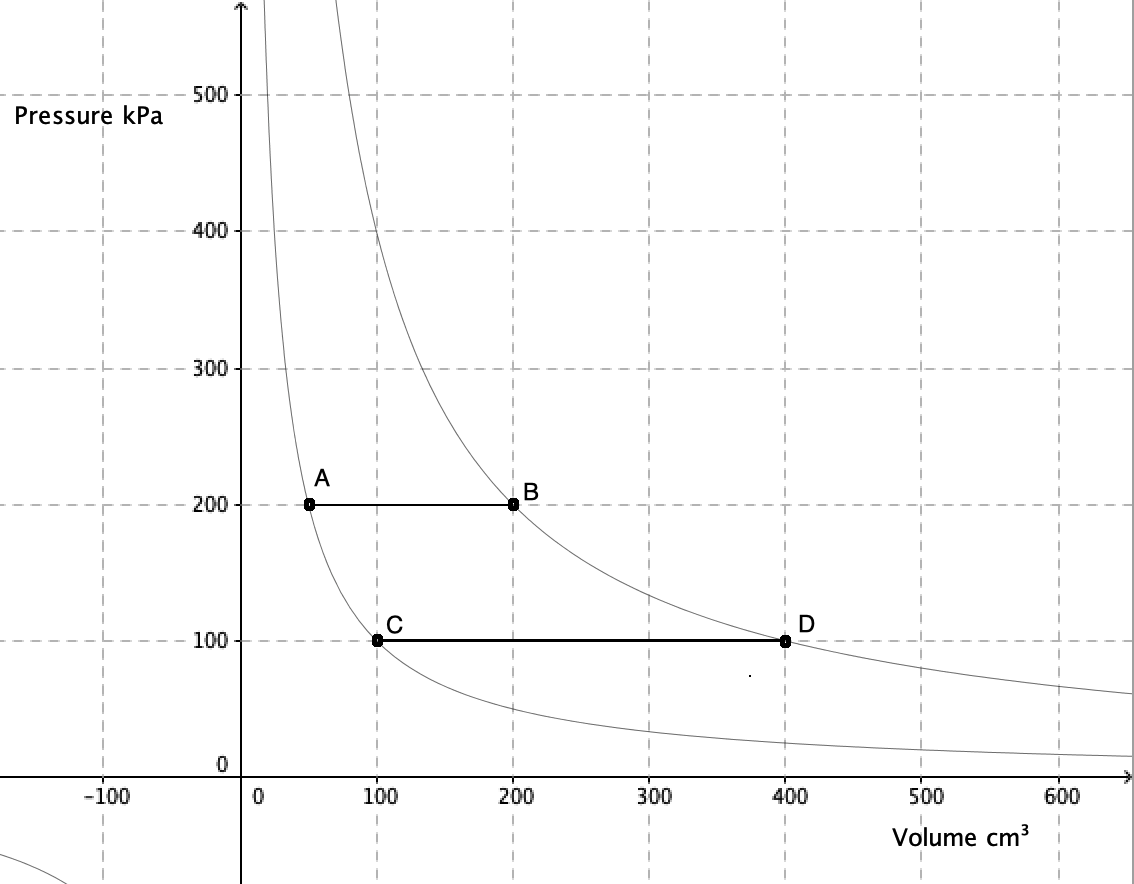 A graph of pressure vs volume (\(pV\) diagram) enables us to show all possible types of process because of the interrelationship between pressure, volume and temperature in the ideal gas law: \(pV\propto T\)