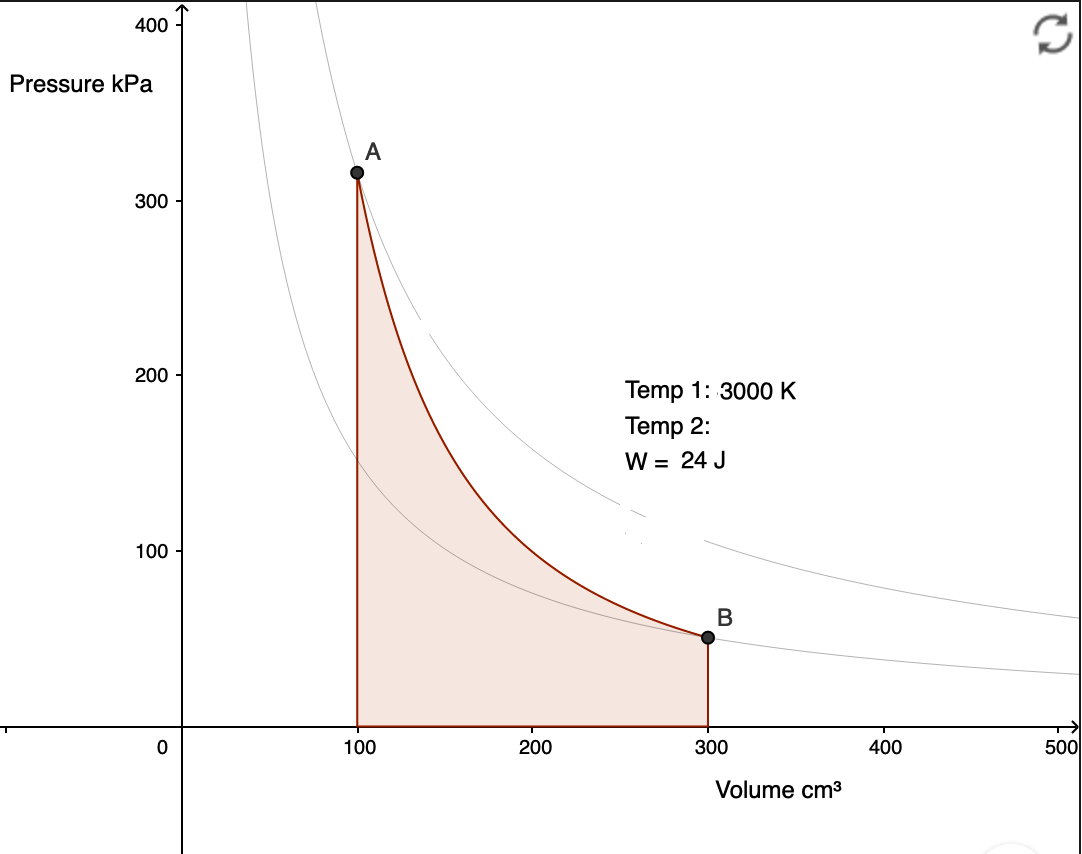 n isothermal process takes place at constant temperature. This is represented by a line of inverse proportion (isotherm) on a