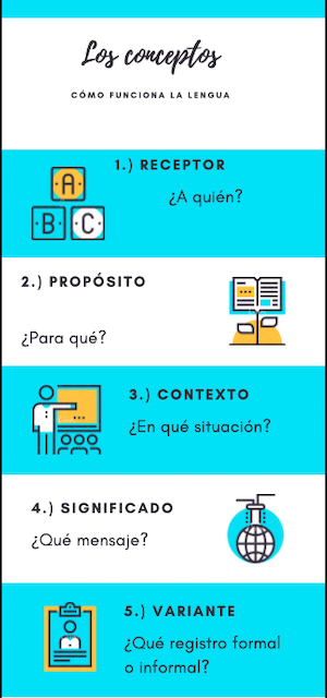 The objective of using written, oral, visual and audiovisual texts is to develop your receptive, productive and interaction skills by focusing your attention on the receiver, purpose, context, meaning and variant (concepts) of the text that you want to read, produce or understand.
