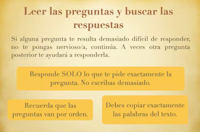 Concéntrate en lo que te pide exactamente la pregunta y contesta solo eso y nada más. No escribas demasiado. Si alguna pregunta te resulta demasiado difícil, no te pongas nervioso/a, continúa. A veces alguna pregunta posterior te ayuda a responder otra pregunta. Recuerda que las preguntas van por orden, es decir, para las primeras preguntas encontrarás la información en el primer párrafo, etc.