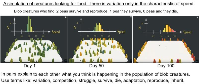 Simulating natural selection - by Primer on Youtube - shows the whole of the blob creature simulation here. It is a bit too detailed for the beginning of this section, but may be a great plenary activity at the end of the topic.