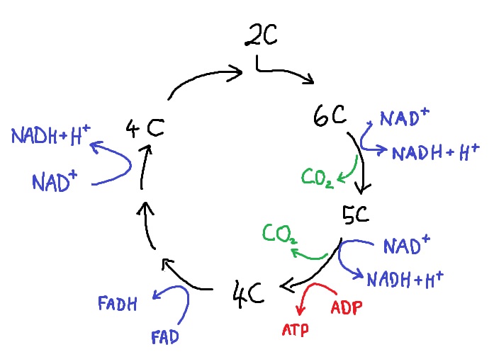 In the Krebs cycle a six carbon molecule (citrate) is turned into a four carbon molecule using the reactions of decarboxylation and oxidation. Use the improved