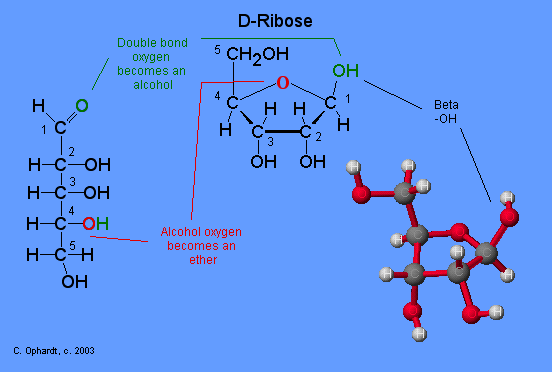 The ribose form β-D-ribofuranose(13%) forms part of the backbone of RNA.