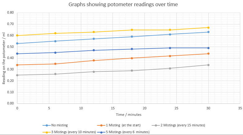 | Potometer readings 1 misting / ml +/- 0.01 ml | 0.34 | 0.35 | 0.38 | 0.40 | 0.42 | 0.44 |