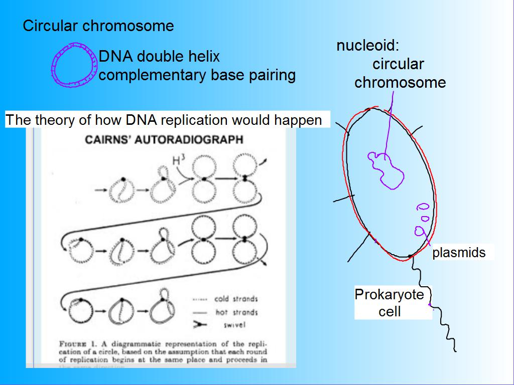 These diagrams illustrate how the model of DNA replication in a prokaryote cell was developed to explain the process. This process was not observable until John Cairns did his experiments. The sketches are based on theoretical understanding,