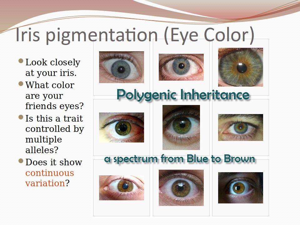 Human iris colour is considered to be a polygenic trait like skin colour. Research has identified several candidate genes for the control of iris pigmentation. It is not known exactly how our genes control eye colour and human iris phenotypes range from light blue to the dark brown.