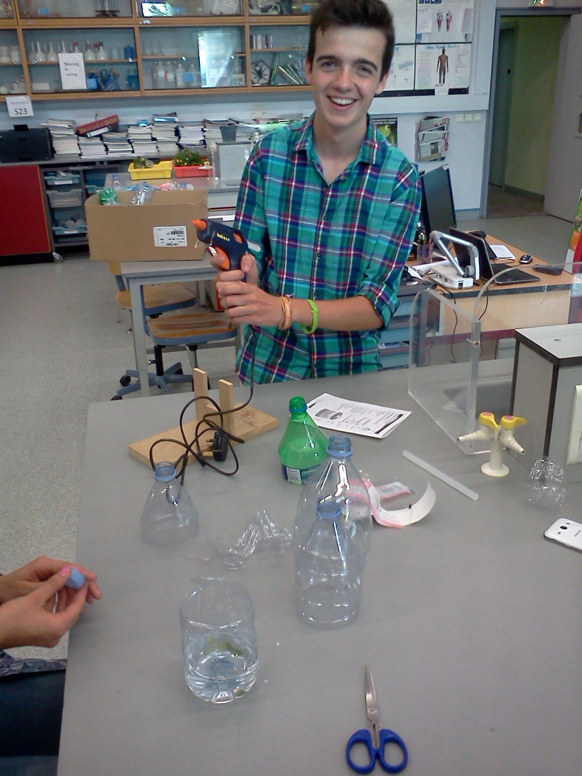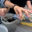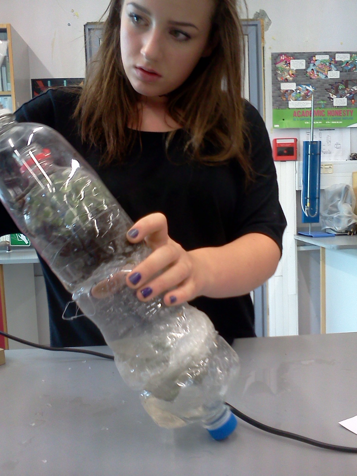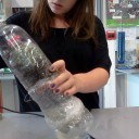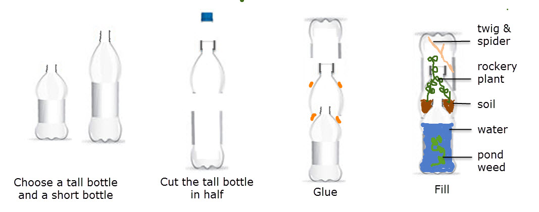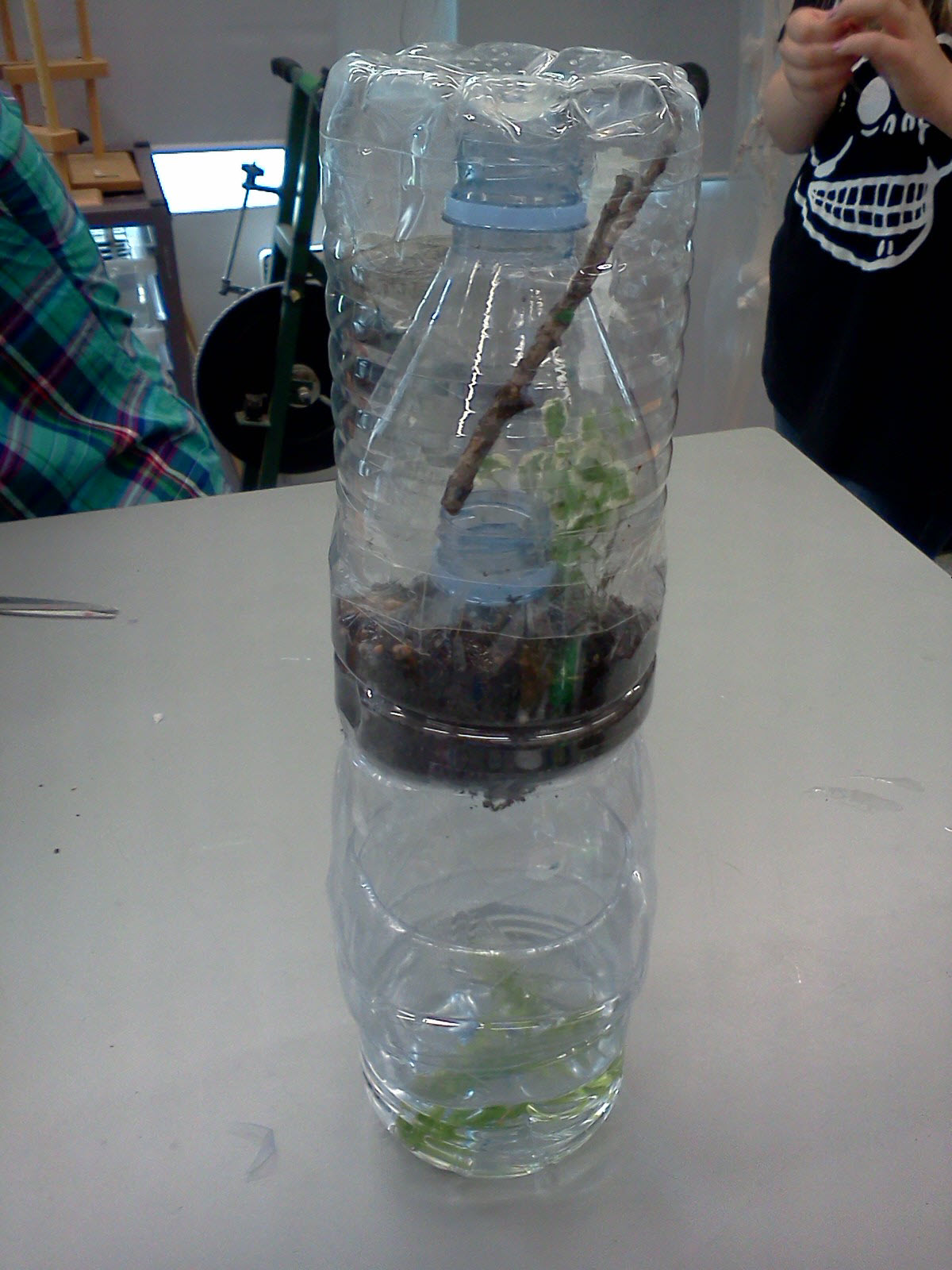 There are many ways to build a mesocosm. This is a particularly simple model from just two or three clear plastic bottles. The width of the bottles at the place they are cut is important so they fit together.