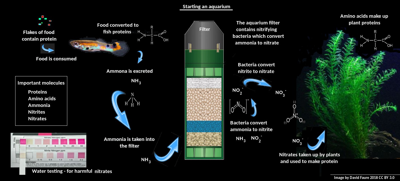 The poster below shows an explanation of the chemical changes which take place in the water of a tropical aquarium.