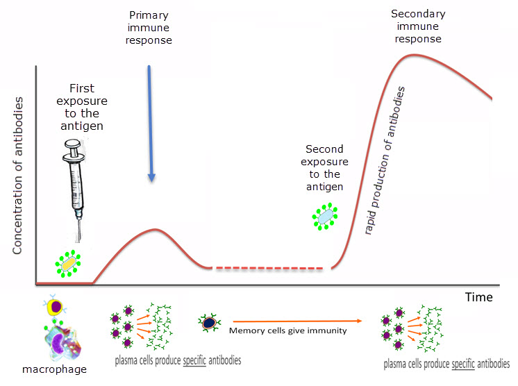 • If the body is infected with the full strength pathogen, memory cells enable it to produce antibodies more rapidly.