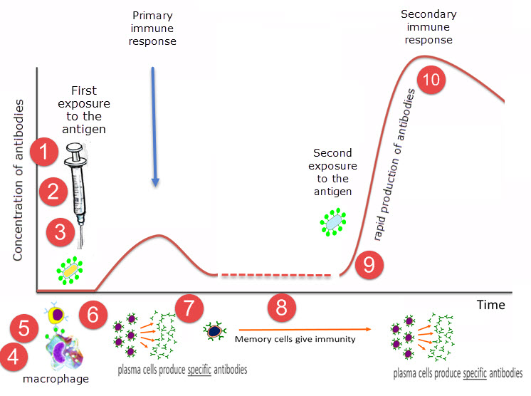 9. If the body is infected with the full strength pathogen, memory cells enable it to produce antibodies more rapidly.