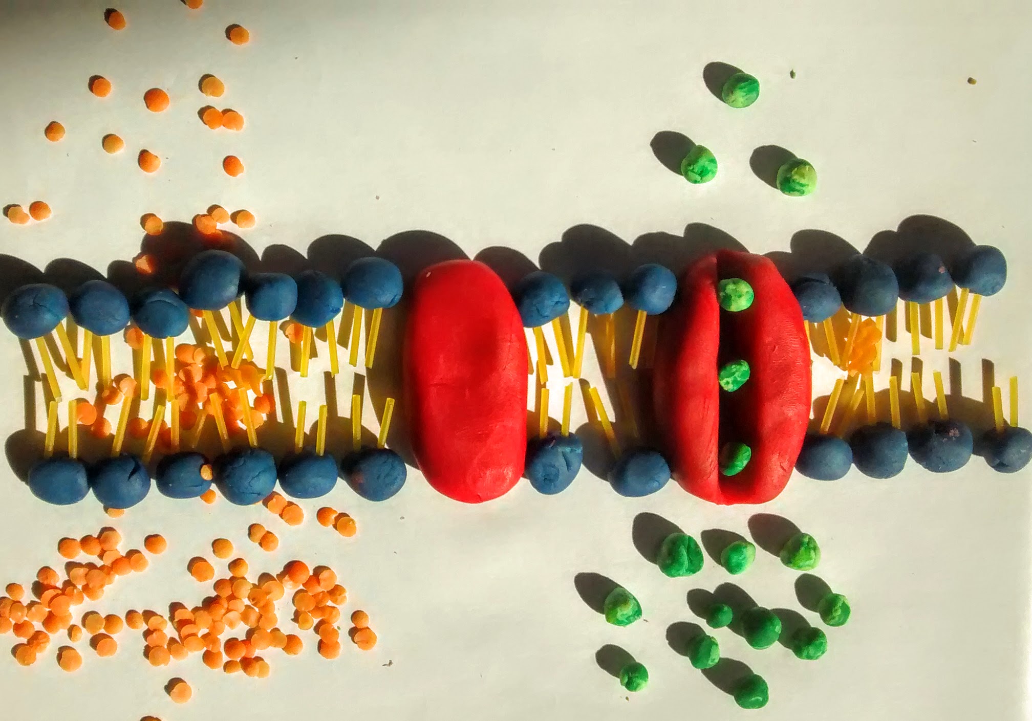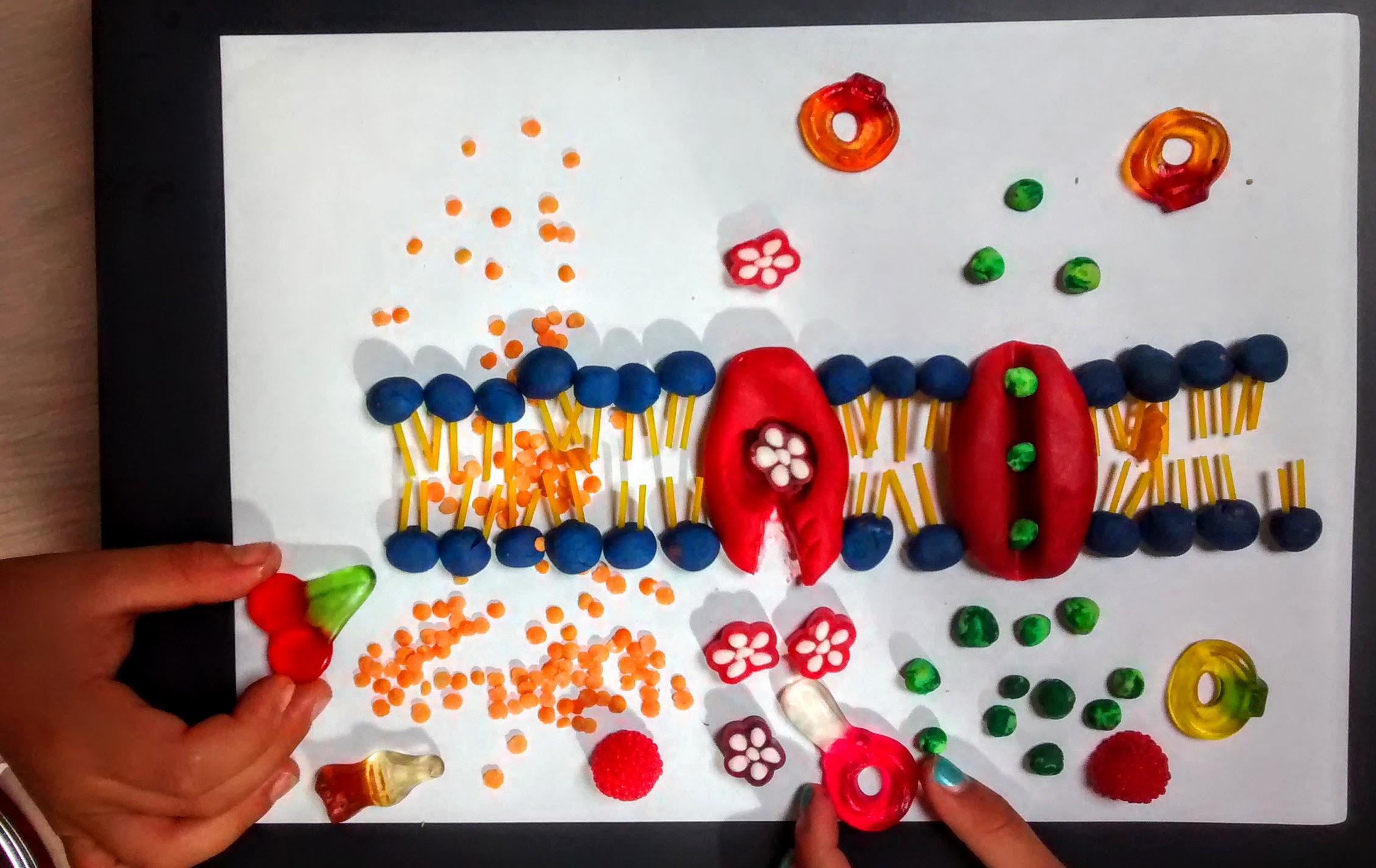 Using all that we know about molecules and about the structure of the cell membranes students are challenged to illustrate the transport of four very different molecules through the membrane using play-doh, spaghetti, food and sweets. Protein pumps, protein channels, and the phospholipid bilayer are central to the story.
