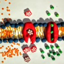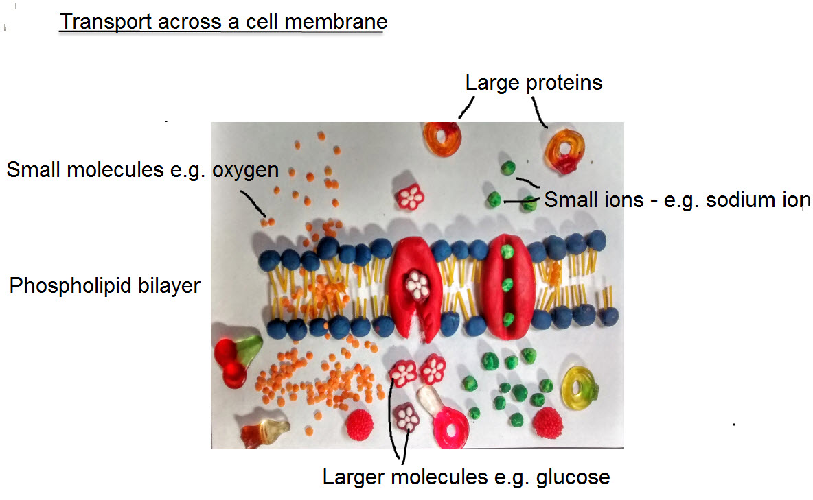 Put together all the phospholipids to make one whole cell. Put a small pile of the bigger sweets which represented proteins in the model next to the cell and ask students