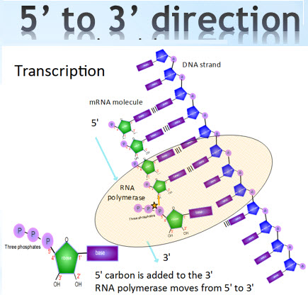 - The direction of Transcription is in a 5’ to 3’ direction as RNA polymerase adds the 5´ end (phosphate) of the free RNA nucleotide to the 3´ end of the growing mRNA molecule.