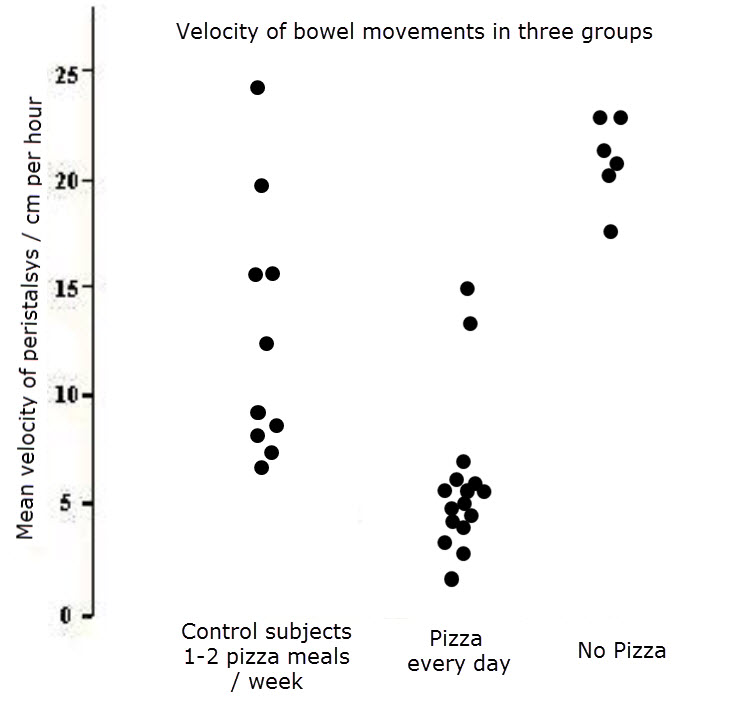 Discuss whether the data in the velocity of bowel movements graph supports the hypothesis that eating chocolate pizza causes slow bowel movements and constipation?