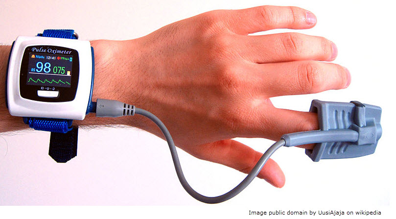 Imagine you have carried out an experiment to measure your blood oxygen concentration at different altitudes on a mountain. You have ten volunteers and they are each tested at six different altitudes. The results in the table below were obtained in this experiment using an oximeter like the one shown in the photo below.