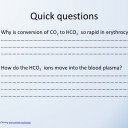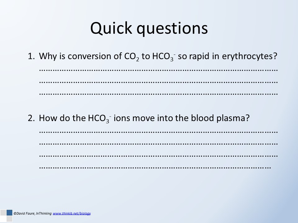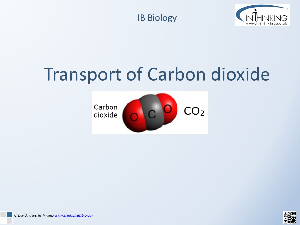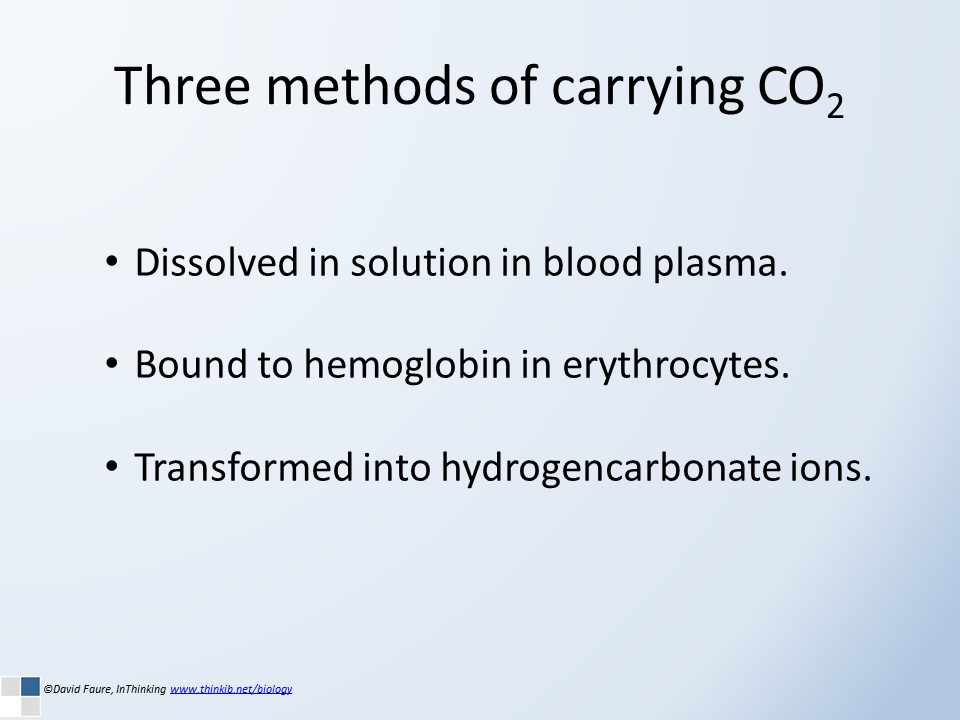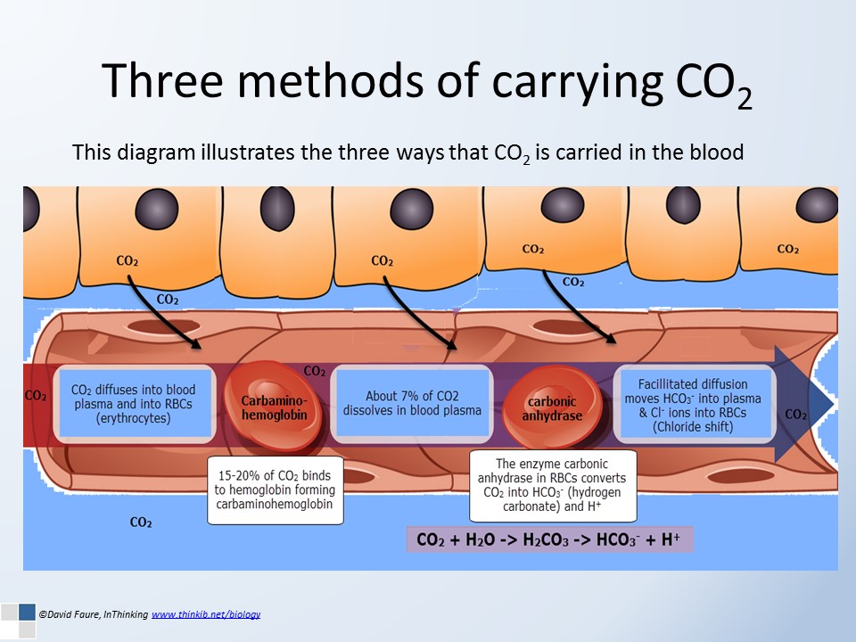 These lesson activities give students an understanding of the different methods of transporting carbon dioxide in the blood, the role of hemoglobin, the enzyme carbonic anhydrase and the Bohr shift. A set of slides introduce the key concepts and these are followed by some questions and model answers. Most (70%) of the CO2 in blood is transported as bicarbonate ions (HCO3-), while 23% is carried in the form of carbamino-hemoglobin. A small fraction (7%) is actually dissolved in blood.