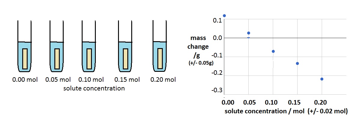 In a simple experiment five cyllinders of potatoe were soaked in five solute concentrations as shown below.
