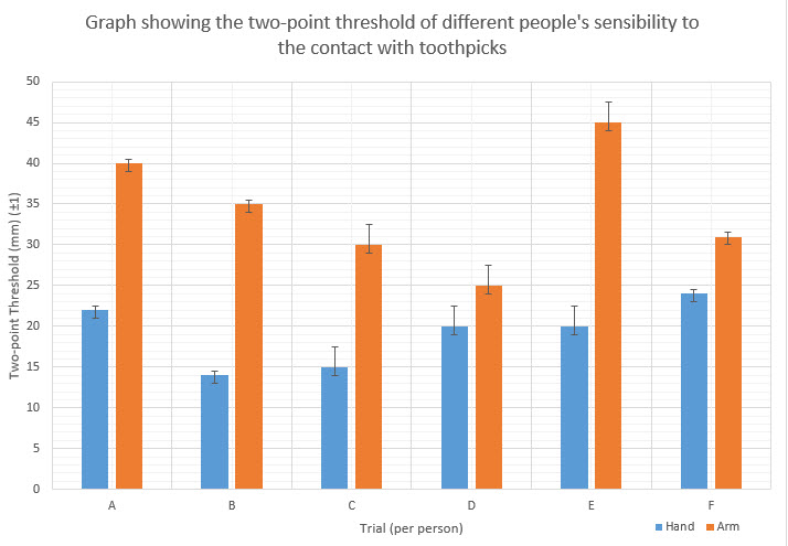 - The two point threshold on the arm is always larger than the threshold on the hand. The uncertainties are smaller than the differences which supports the idea that the difference is significant, although there is quite a lot of variation between the trials which me less confident of the conclusion.