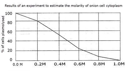 - When a sample of cells is 50% plasmolysed we say that the solution they are bathed in has the same salt concentration as their cytoplasm. Estimate the concentration of the cytoplasm of the onion cells using the graph (on the right)?