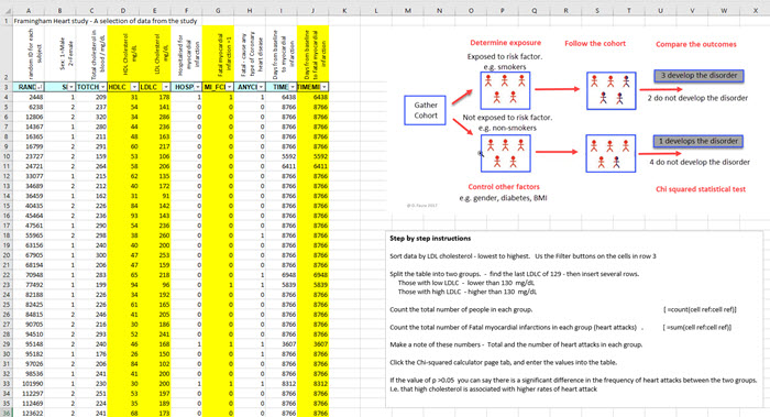 The last activity is a challenging one, and it may be of interest to students who might like to do an individual investigation using some medical databases. The Framingham teaching dataset has been very simplified and the essential columns have been highlighted in yellow to help navigation. Within the Excel file there is also a sheet with a Chi-squared test calculator and another sheet which shows the data analysis analysis of the original data completed.