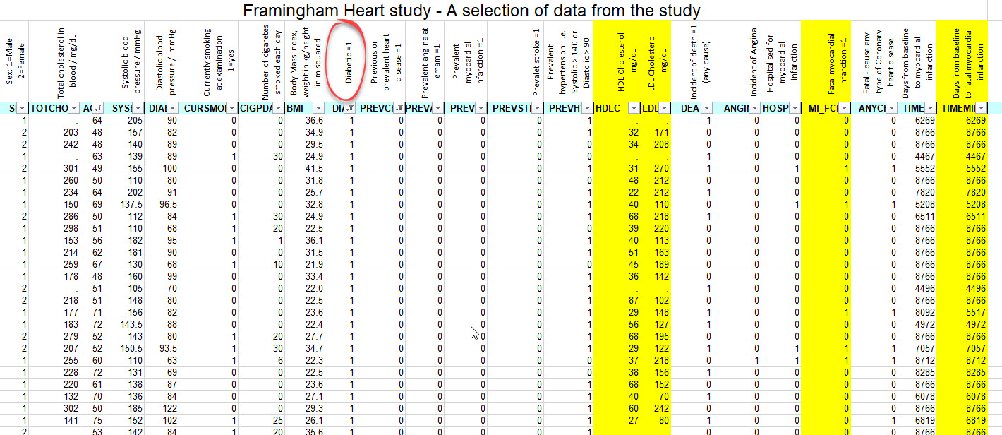 Excel file of part of Framingham data set. - Click on the Framingham data selection tab - to see the data