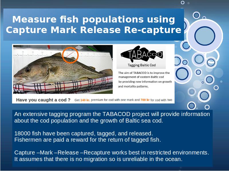 In activity two, a case study of fisheries conservation, taken from the Baltic sea, is used to give students an opportunity to look at some real data and to consider the limitations of the capture-mark-release-recapture method.