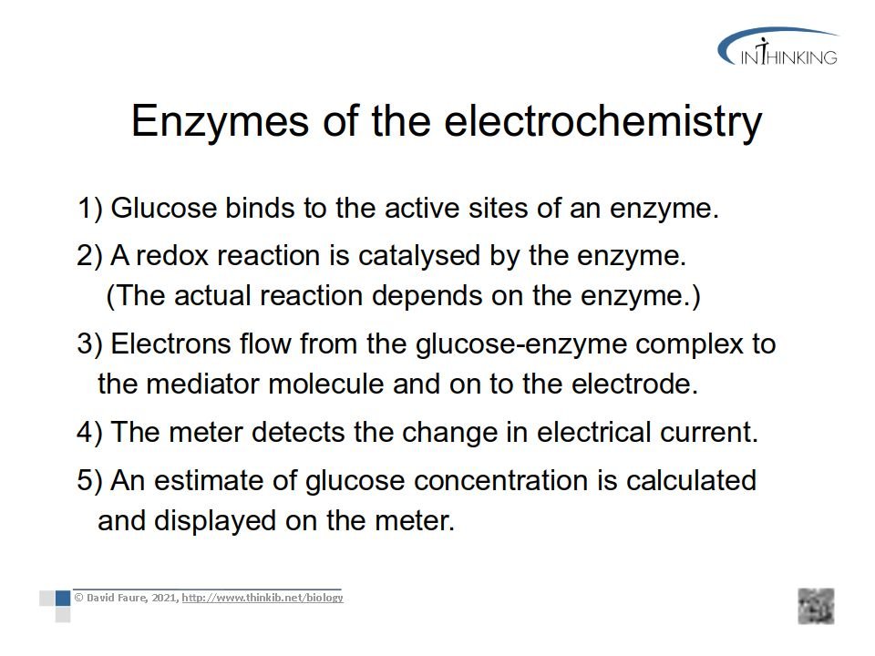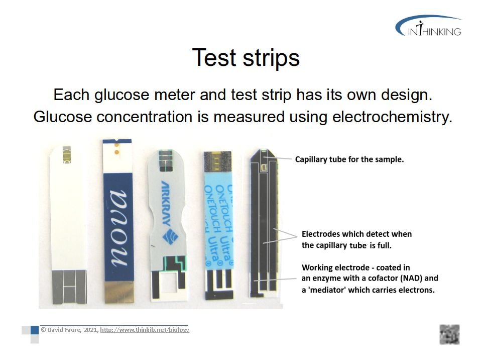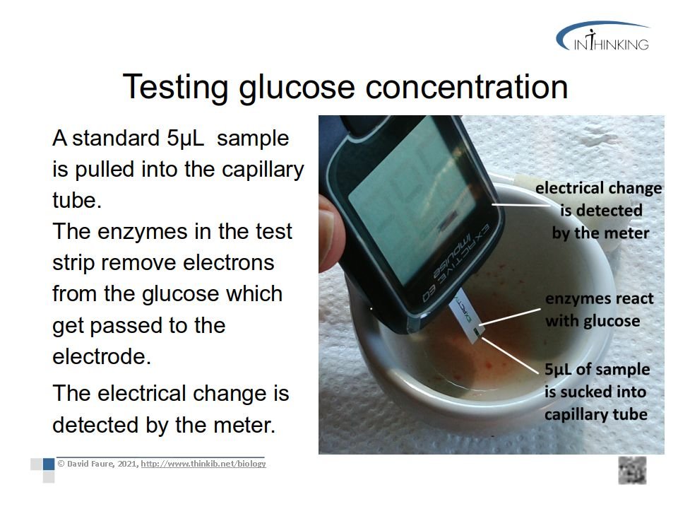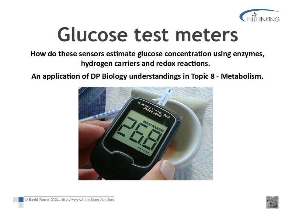 A knowledge of redox reactions and hydrogen carriers associated with enzymes is important in the metabolism and respiration topic. An understanding of the metabolism of glucose is not covered in topic 8 but is important in understanding glucose metabolism and diabetes in topic 6 Human physiology. The slides below introduce Blood glucose test meters.