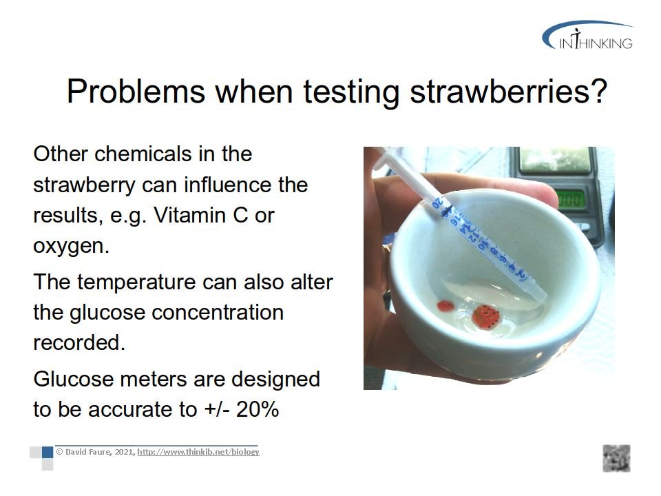 - Which factors (size, shape, ripeness, colour, density, etc.) might influence the concentration of glucose in a strawberry?