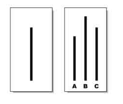 The naive participant entered a room where there were six men and the researcher. These men were part of the study, and they were playing a role unknown to the participant. They were confederates that helped the researcher to deceive the participant. The true aim of the study was to investigate how the naive participant would respond to group pressure in a situation where confederates give wrong responses to an unambiguous task. After the participant took his seat, he was shown cards similar to the ones depicted here.