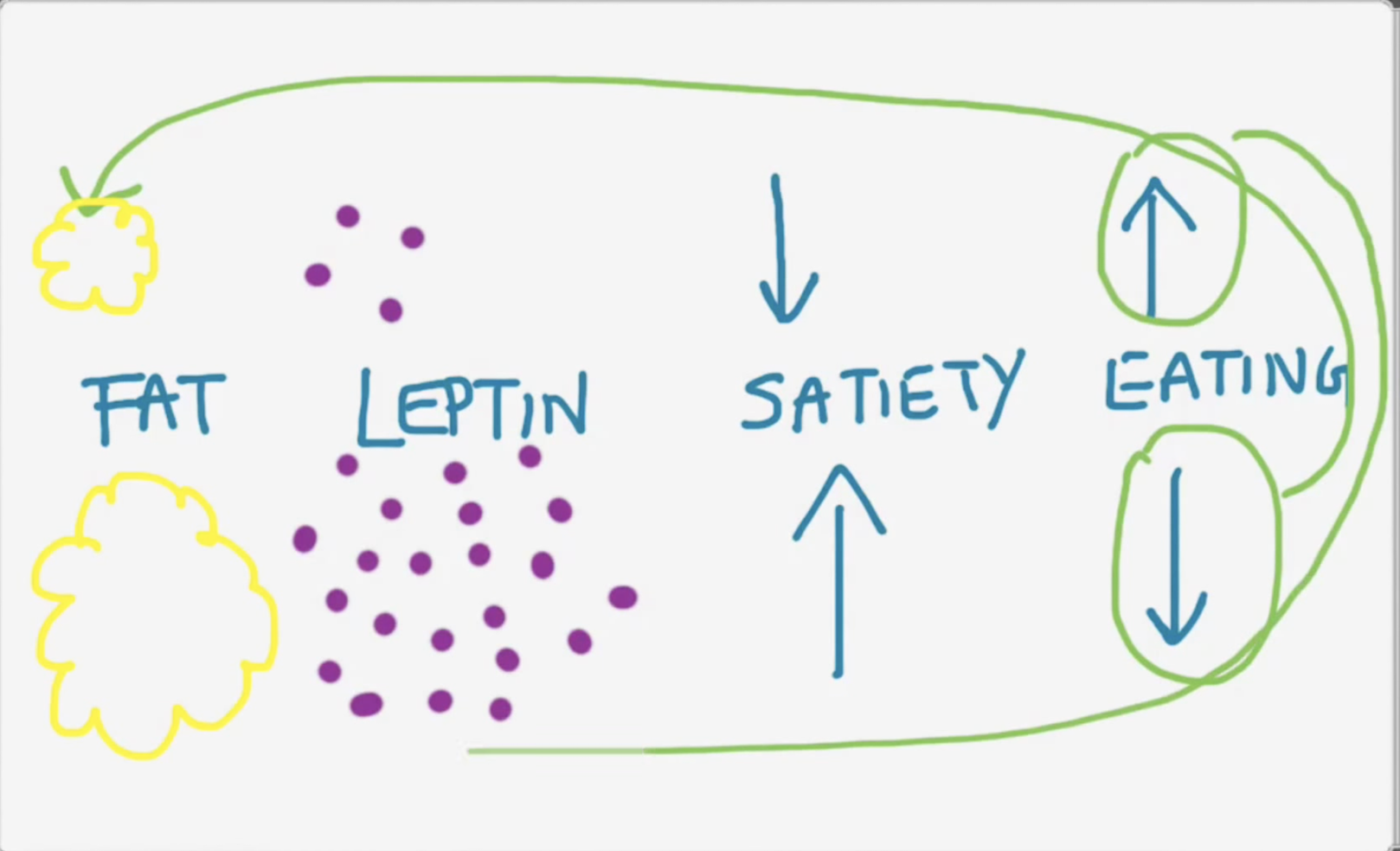 When we stop eating, over time, as we burn off energy, fat cells decrease and a hormone called ghrelin increases. The increase in ghrelin makes us feel hungry, so we eat. When we eat, the fat cells increase in size, leading to an increase in leptin, causing us to stop eating.