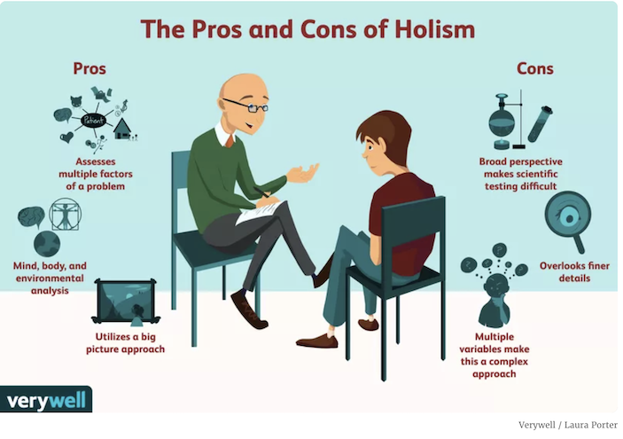Holism refers to any approach that emphasizes the whole rather than its constituent parts. Holistic approaches collect qualitative data and attempt to understand how the context or environment of an individual may affect their behaviour. They recognize that there are many factors that may interact that lead to a behaviour.