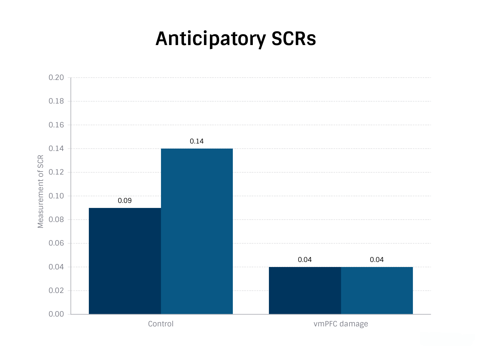 The results showed that control participants (with no brain damage) quickly learned the best strategy while those participants with bilateral damage in the vmPFC did not fare so well. It also showed that the control participants developed anticipatory skin conductive responses to the disadvantageous decks (A and B); however, the vmPFC had a significantly lower anticipatory SCR and no clear difference in SCR between the two conditions.